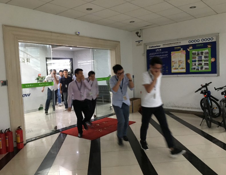 员工见到浓烟,在疏散组成员的引导下,迅速通过最近的楼梯通道,到达楼下集合处,救援组成员背着伤员模仿者也紧随其后,还有灭火组成员携带灭火器到场,警戒组成员全程负责安全警卫。整个过程紧张而有序。