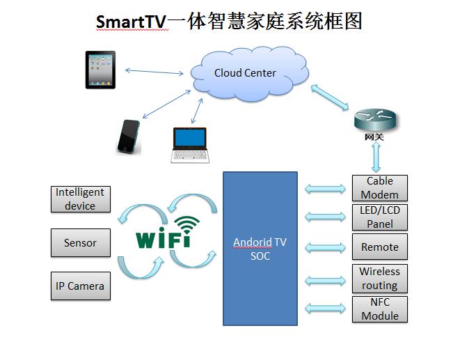硬件方面,智能一体机集成了SmartTV、宽带Modem、无线路由、NFC模块,结合已开放软件标准开发套件,后期可望扩展支持越来越多的智能设备连入;